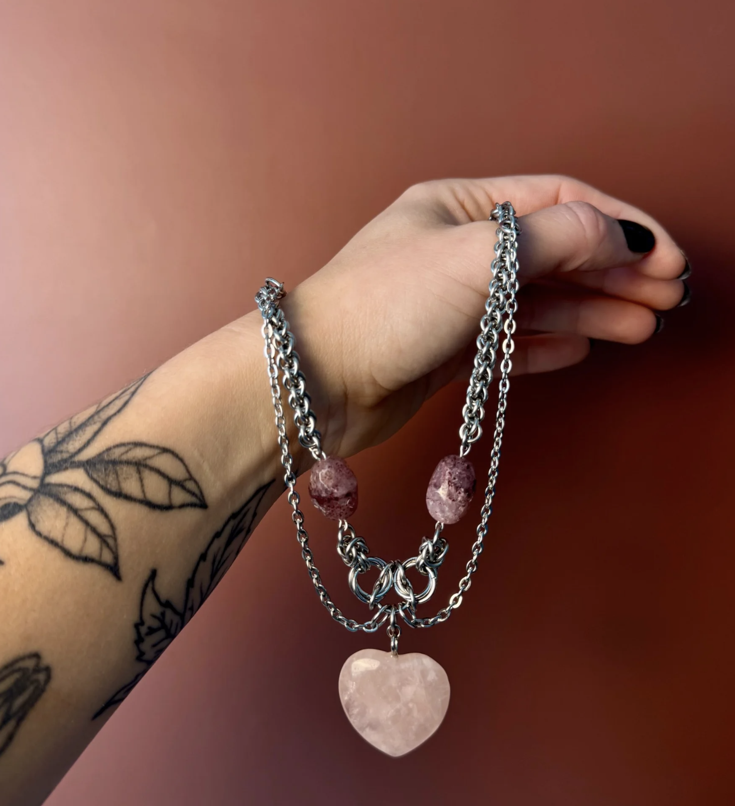 Each piece is crafted from stainless steel, rose quartz, and strawberry quartz. Natural variations in the stones — including differences in shape, tone, and surface — make every piece unique, adding depth and character.