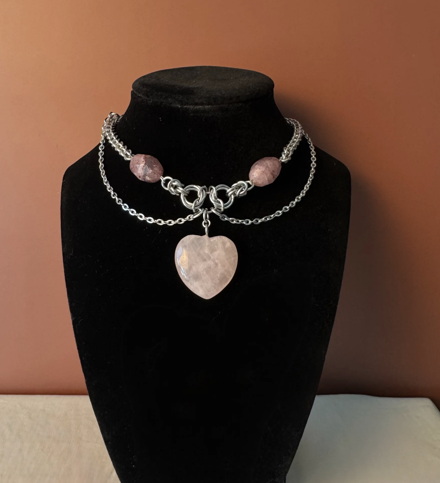 Romantic, bold, and magnetic. Designed to sit close to the neck, this piece centers around a rose quartz heart, anchored by strawberry quartz and chain details. Structured at the collar with a soft drape below, it balances strength and emotion in a single silhouette.
