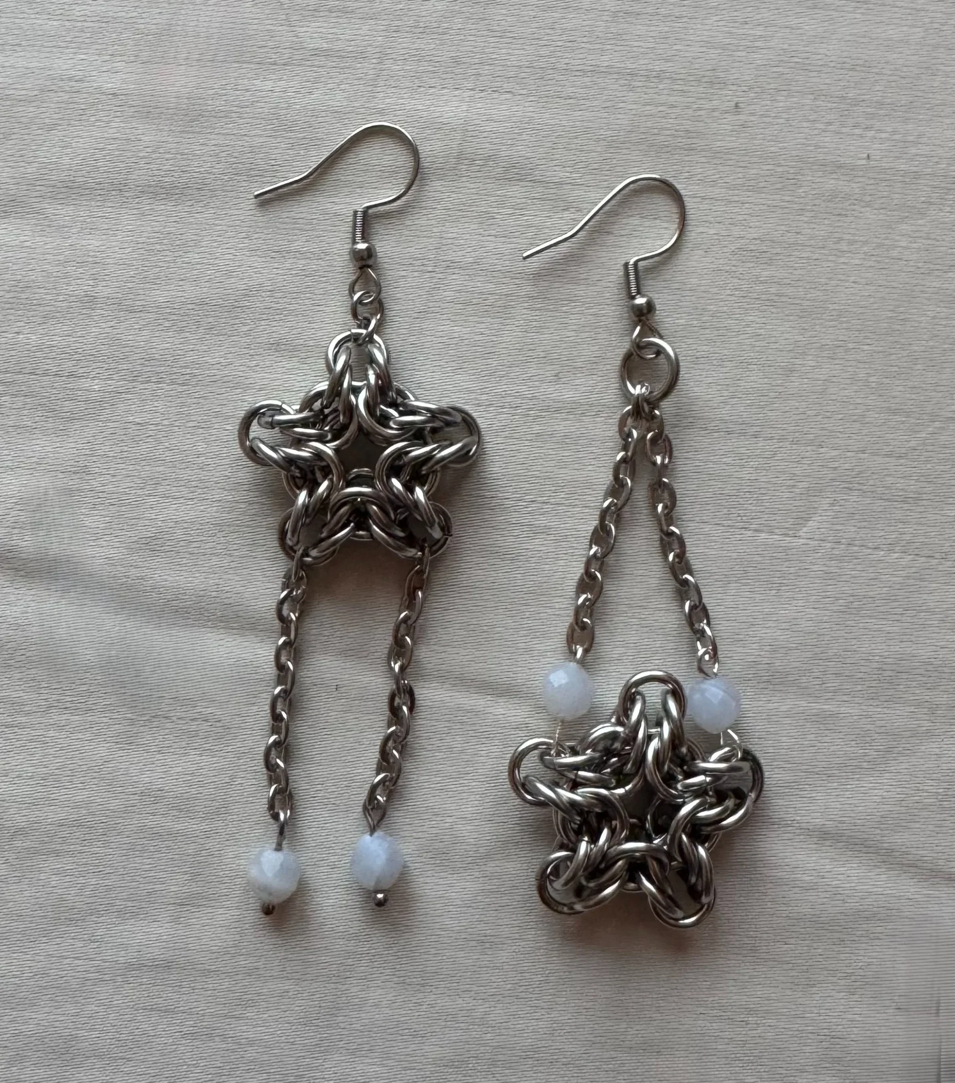 The Astra Earrings — handcrafted chainmail earrings made from stainless steel, featuring star forms and blue lace agate details.