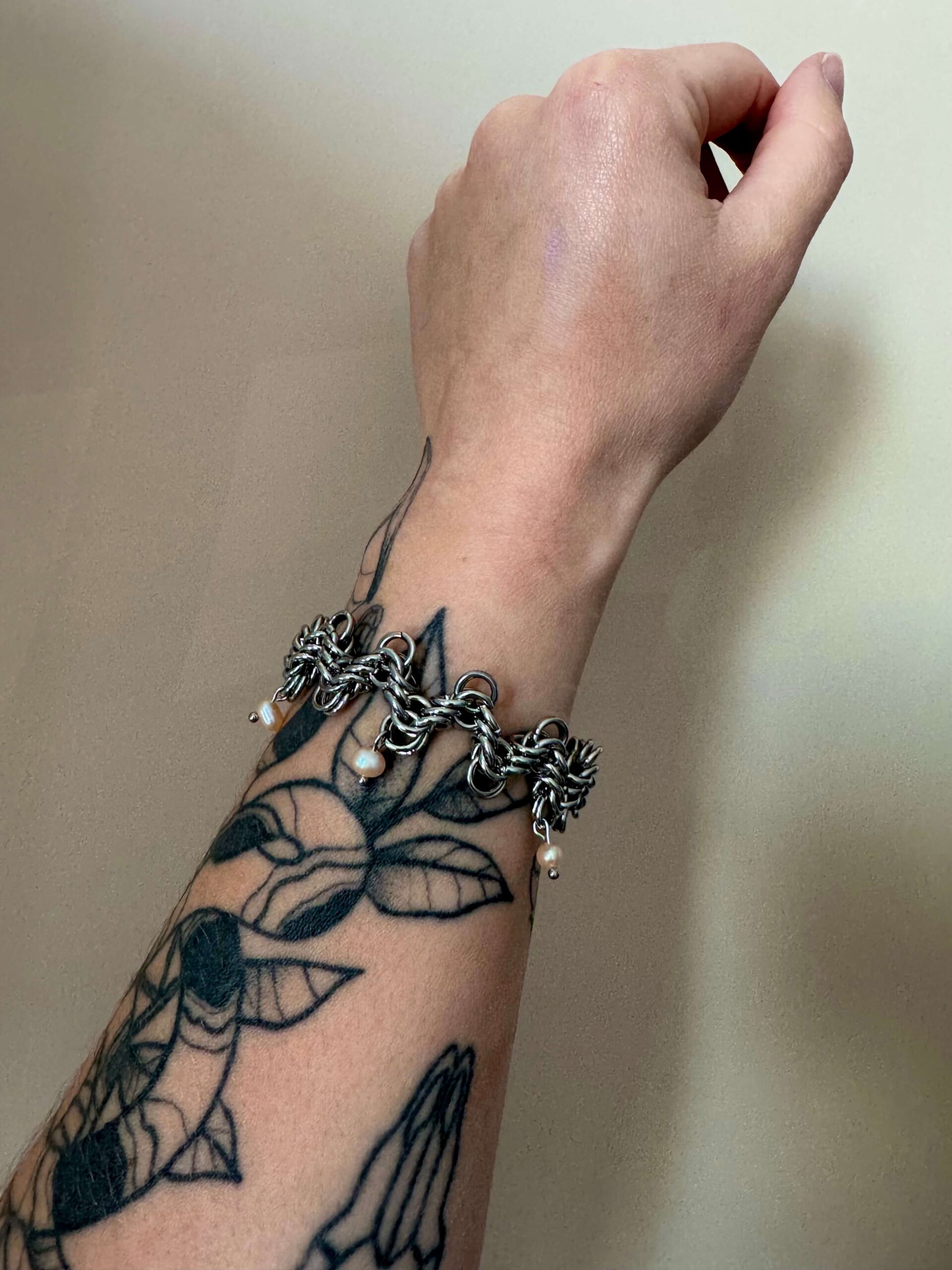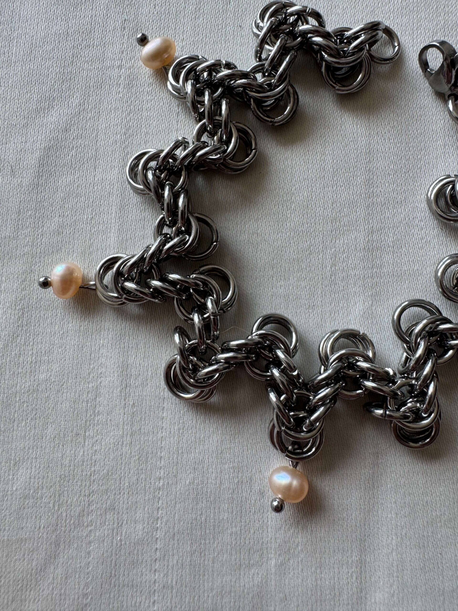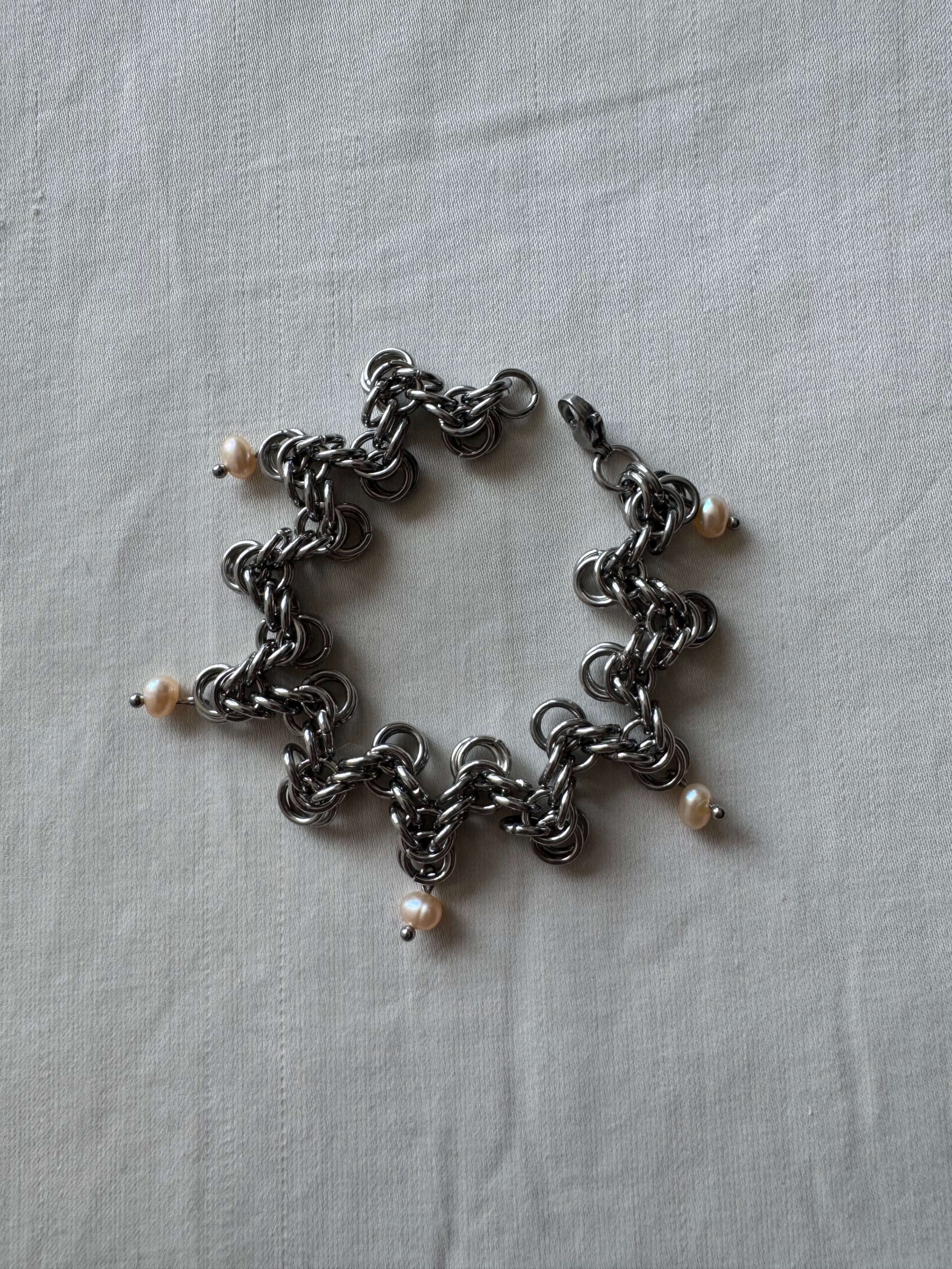 The Lana Bracelet – a handcrafted pearl chainmail bracelet made from stainless steel and freshwater pearls.