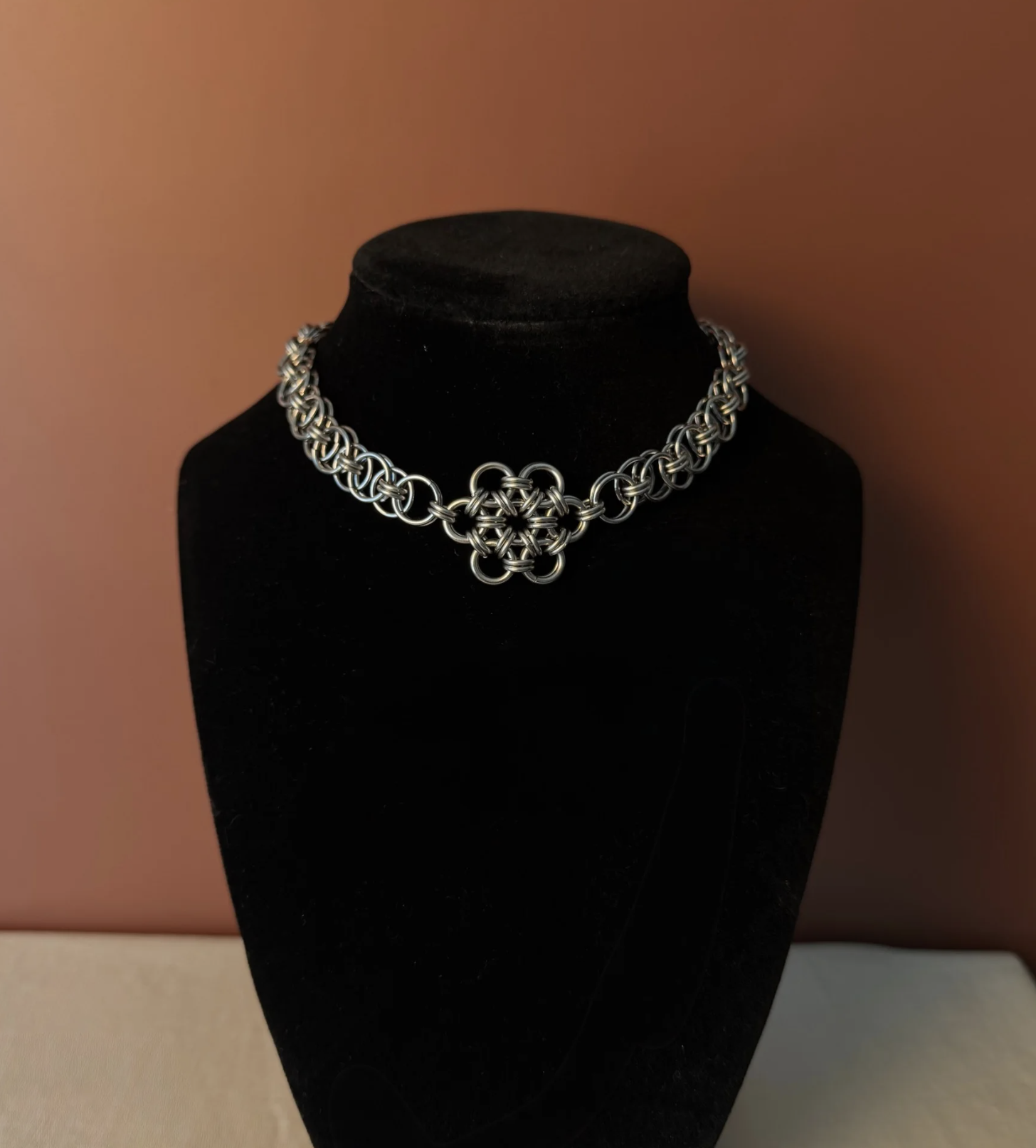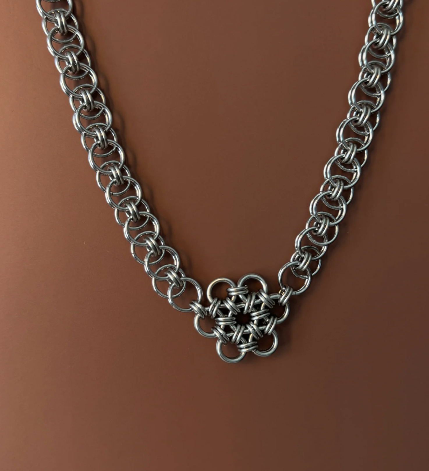 The Lililth Choker – a handcrafted chainmail choker necklace designed to sit close to the neck with a bold, feminine presence.
