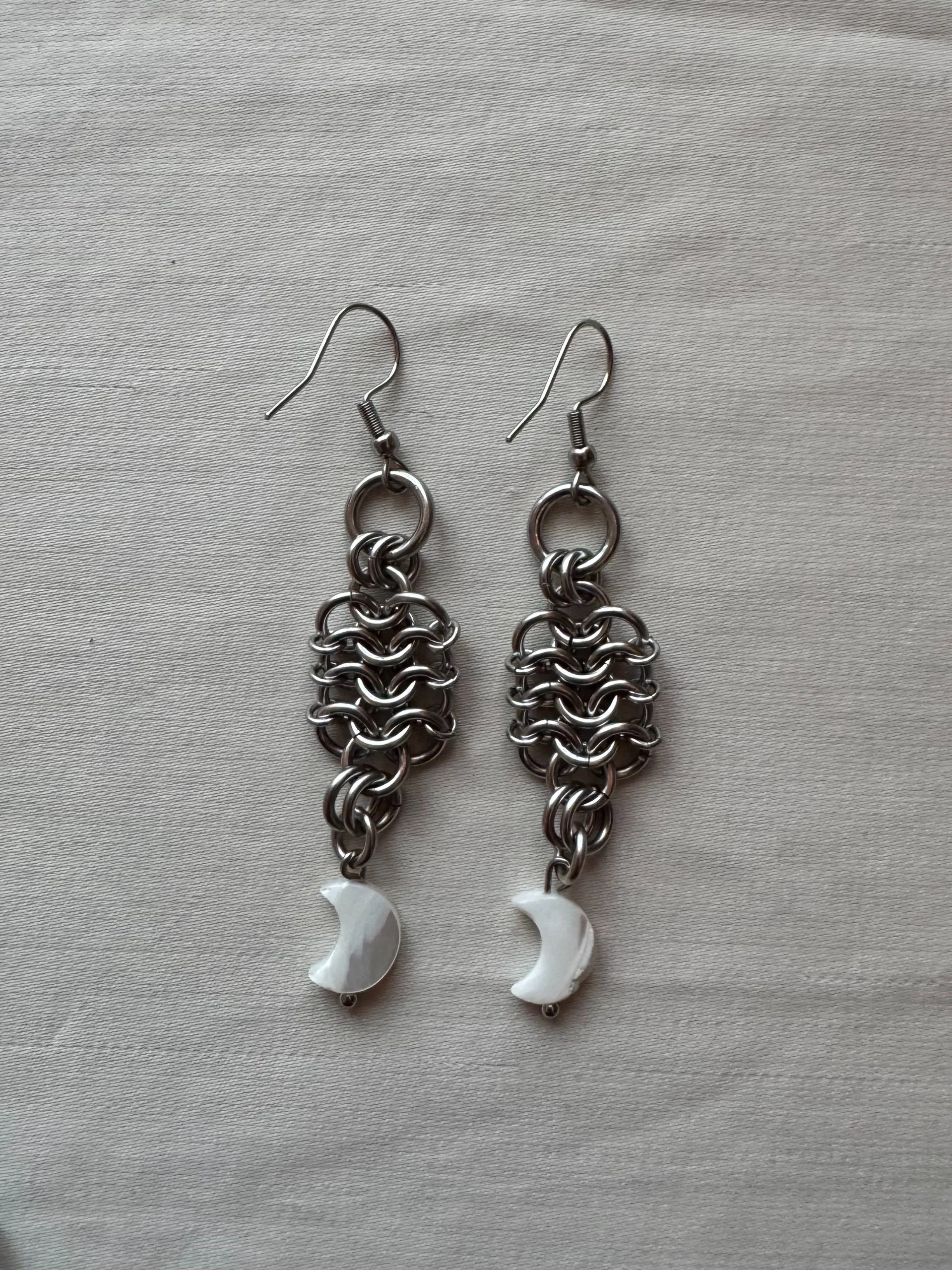 The Lunette Earrings — handcrafted chainmail earrings made from stainless steel, finished with pearl moon details. Designed as a part of the Winter Celestial Collection.