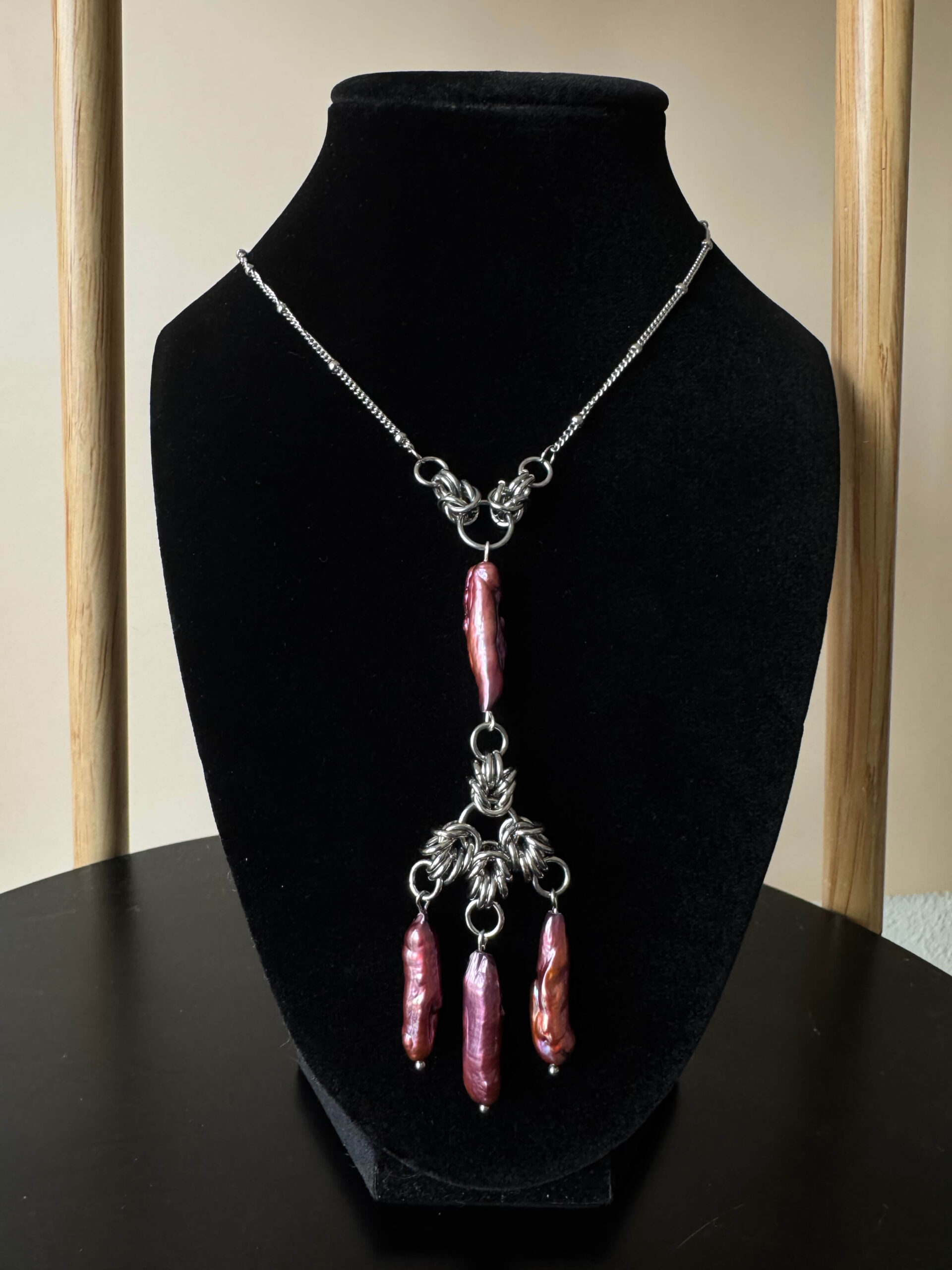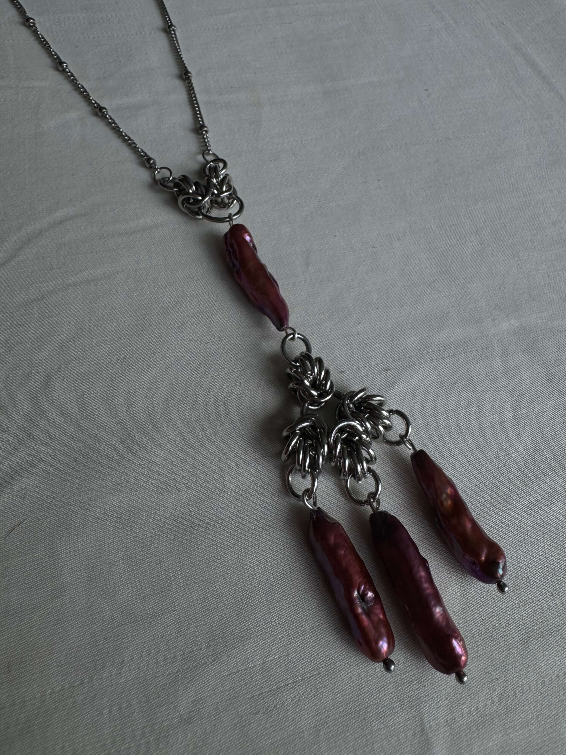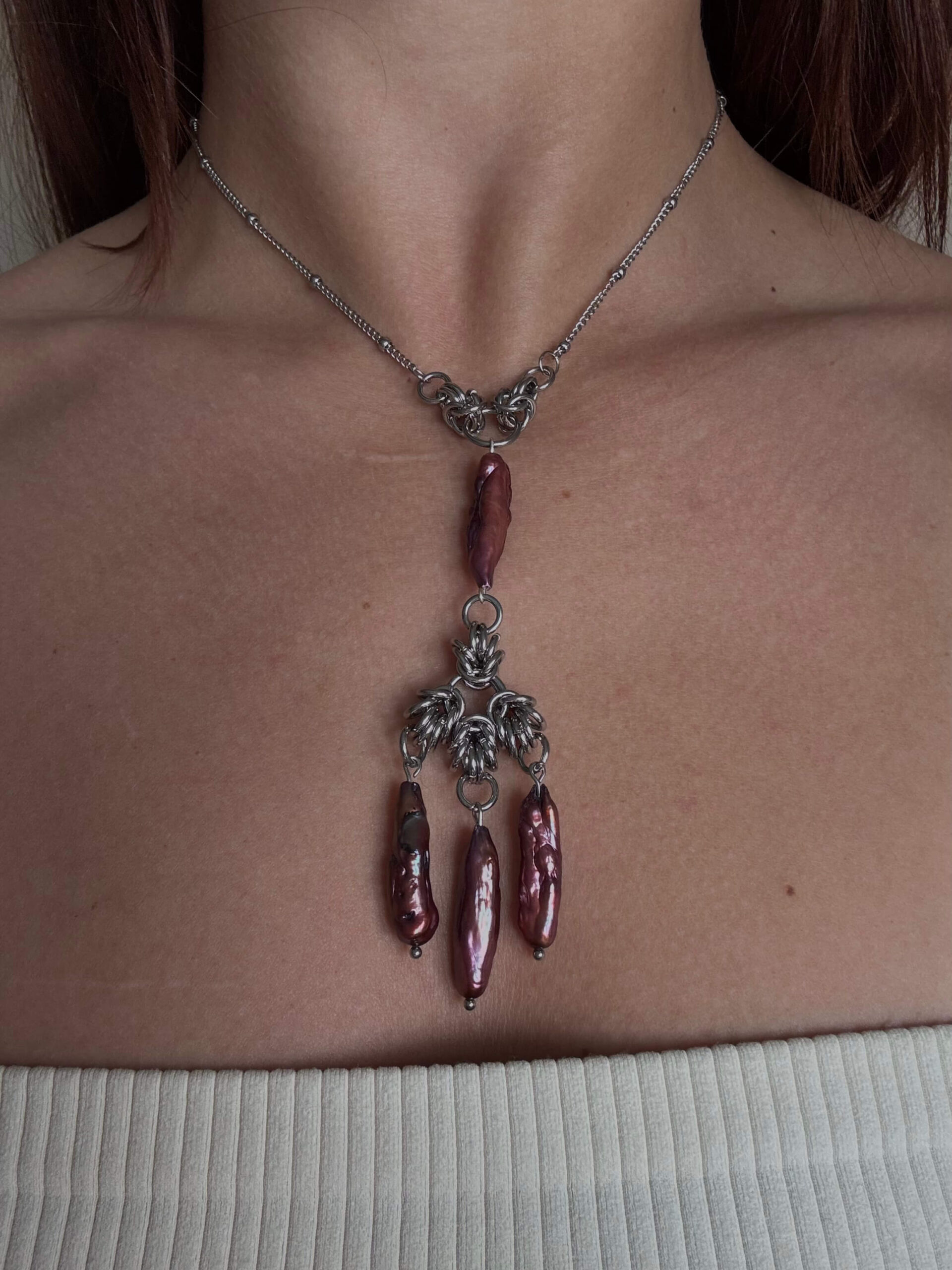 Each piece is crafted from stainless steel and baroque pearl adornments. Each pearl varies slightly in shape, tone, and surface — including subtle indentations or markings — making every piece unique.