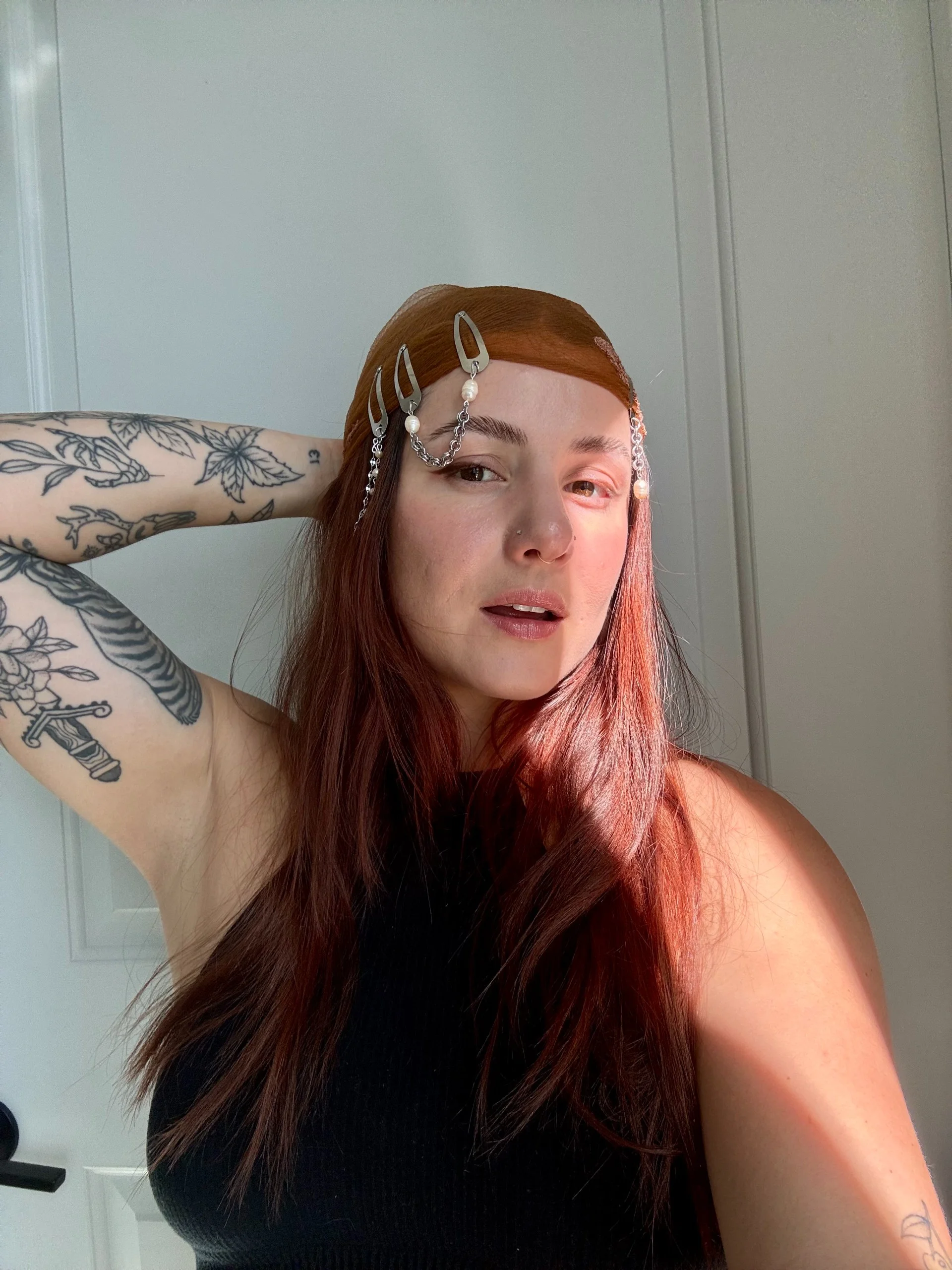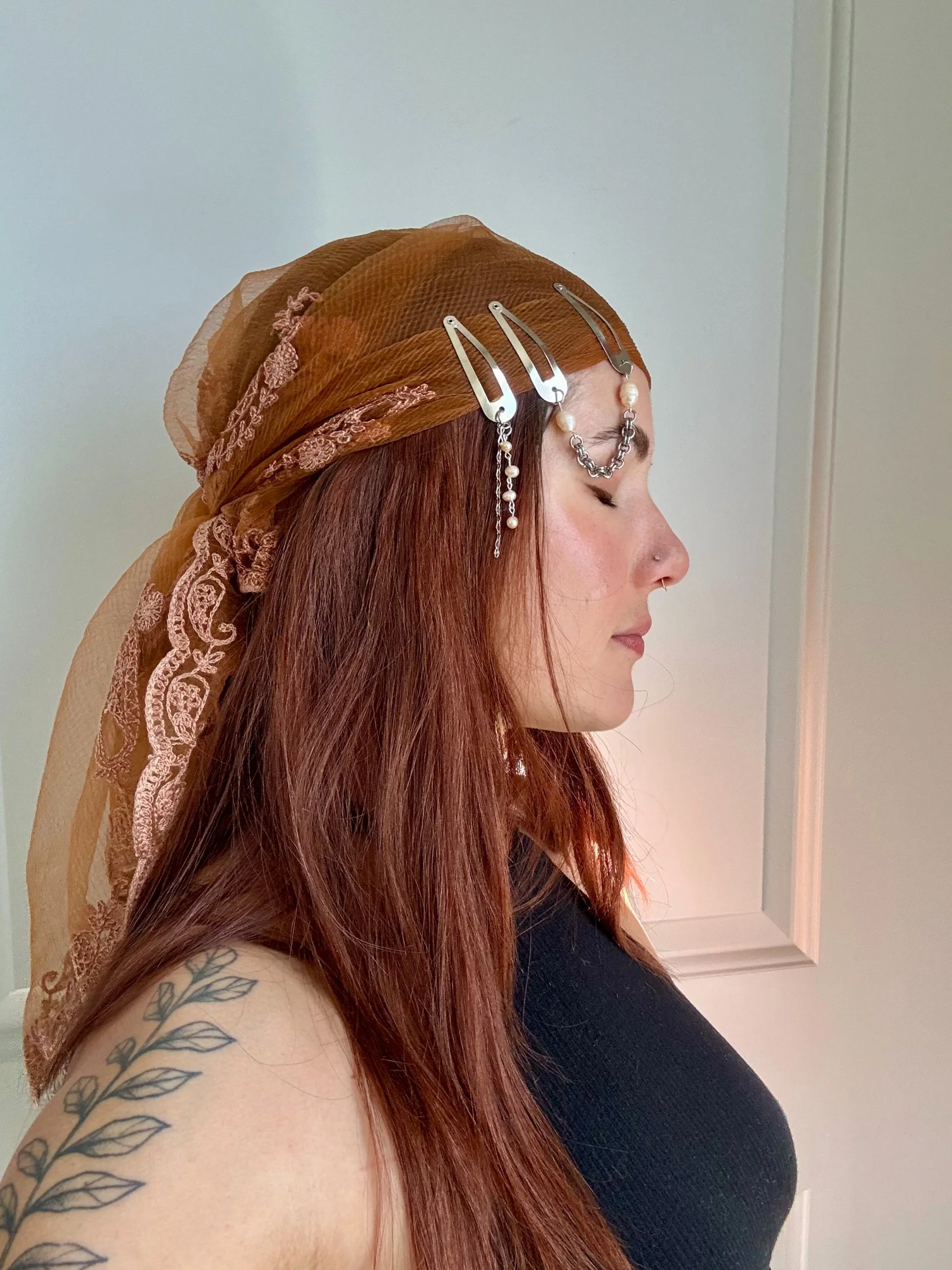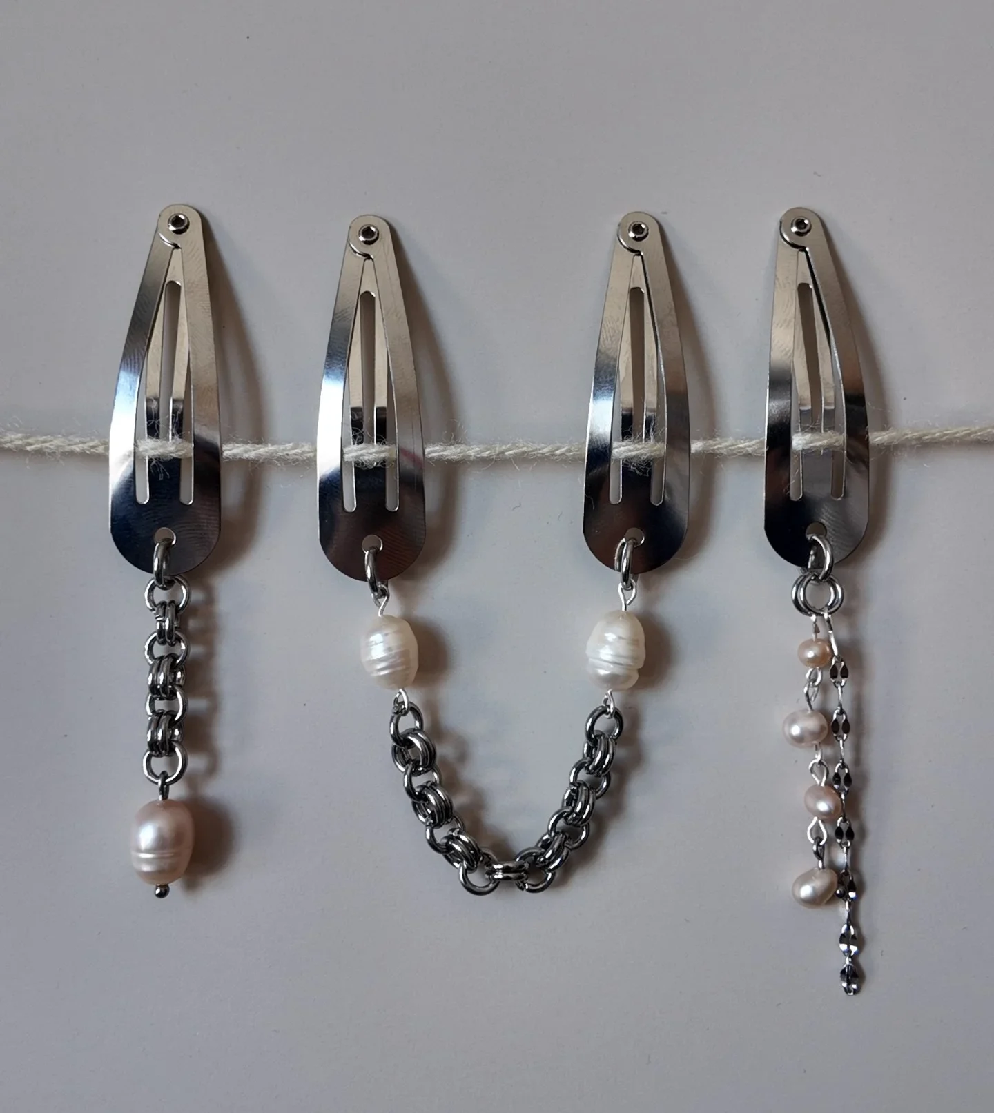 Each piece features an alloy metal barrette base for structure and hold. Adornments are crafted from stainless steel and freshwater pearls. Pearls are formed naturally, making every piece one of a kind. Variations in shape, tone, and surface — including slight indentations or markings — are part of their organic character, set against the precision of the metal.