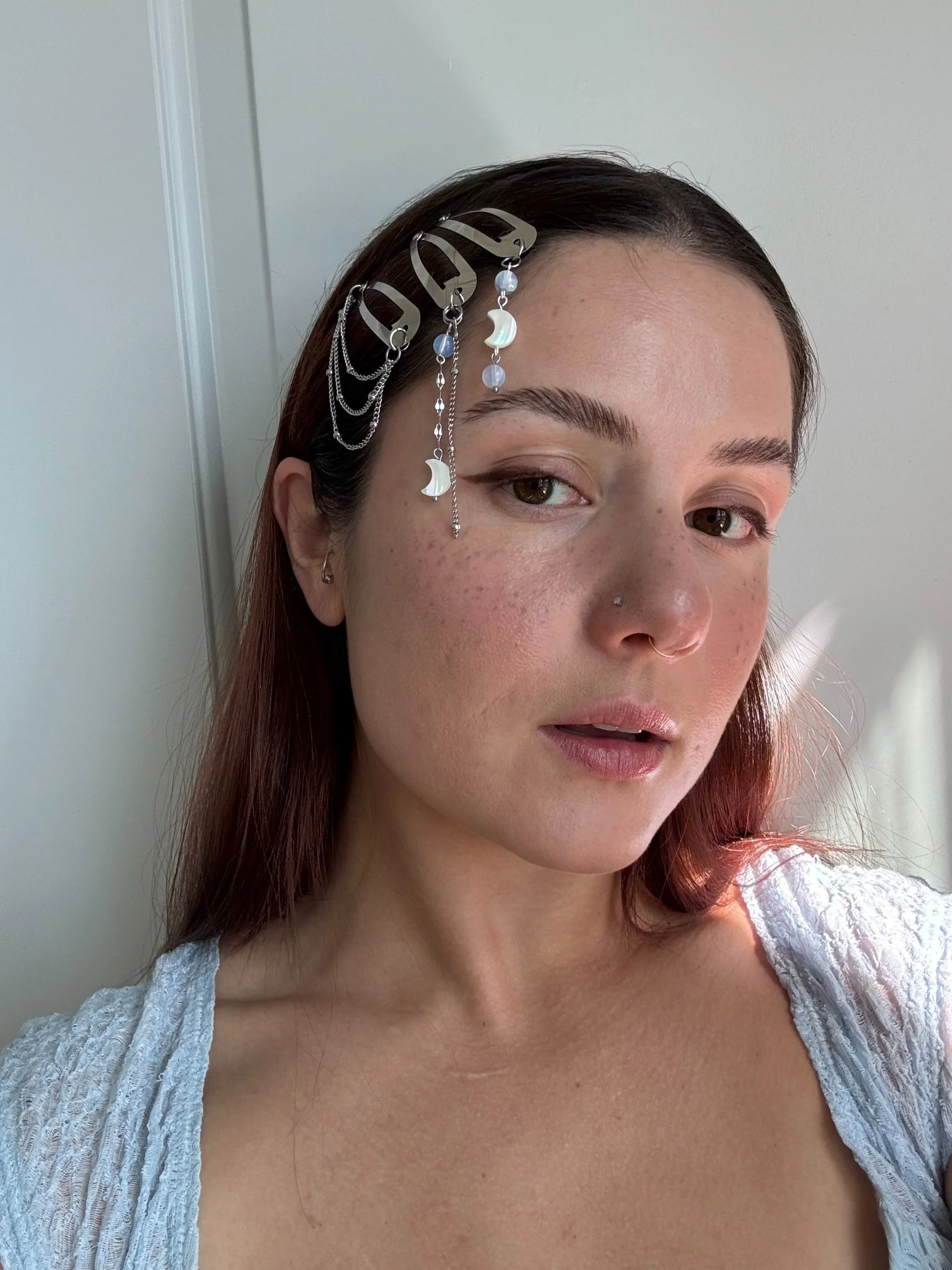Each piece features an alloy metal barrette base for structure and hold. Adornments are crafted from stainless steel, pearl moons, and opalite beads. Each adornment may vary slightly in shape, tone, and surface — including subtle indentations or markings — making every piece unique.