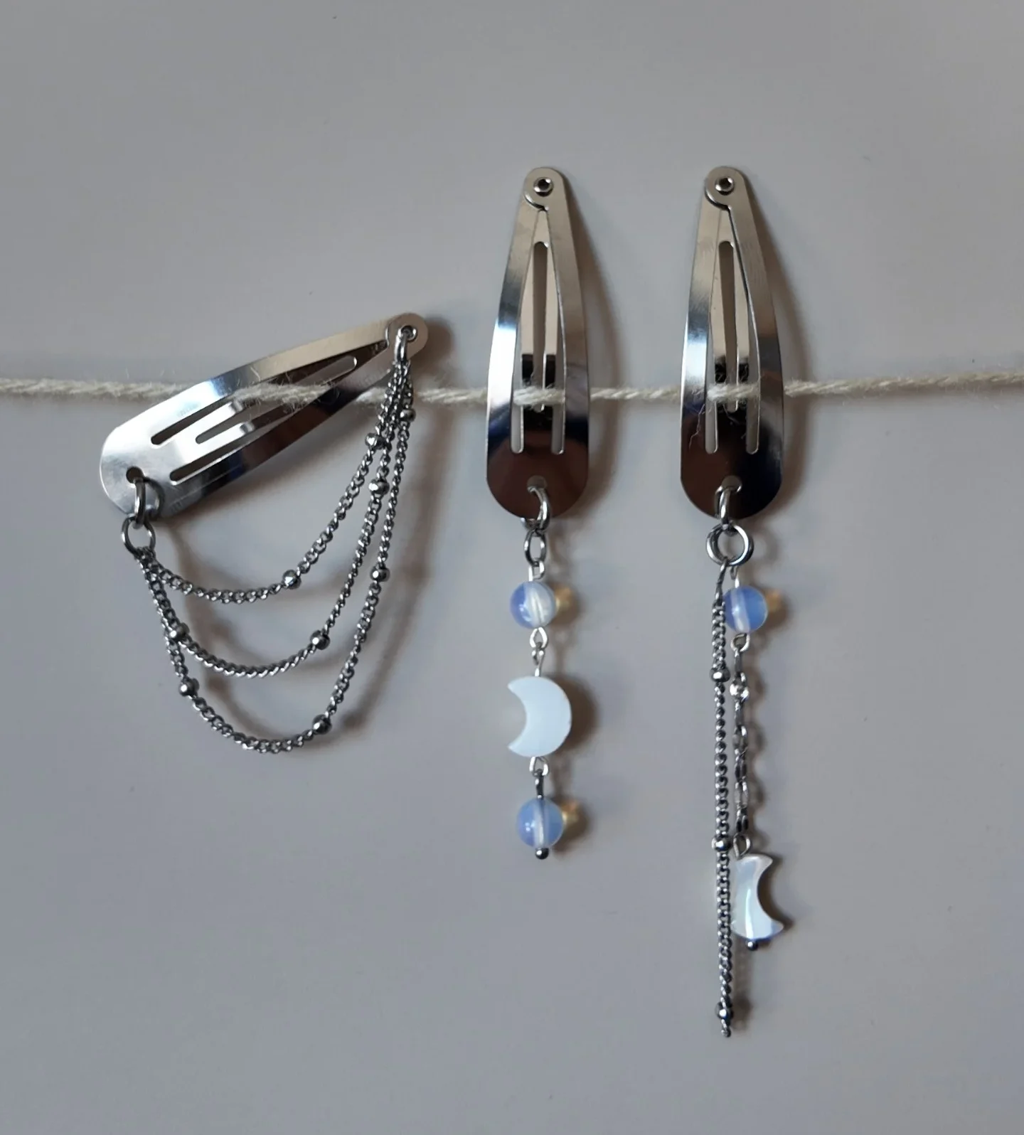 Stainless steel resists tarnishing and is designed for longevity. To maintain its finish, polish gently with a soft cloth as needed. Alloy metal barrettes, pearl moons, and opalite beads require more delicate care — avoid prolonged contact with water, oils, or chemicals, and store thoughtfully when not in use.