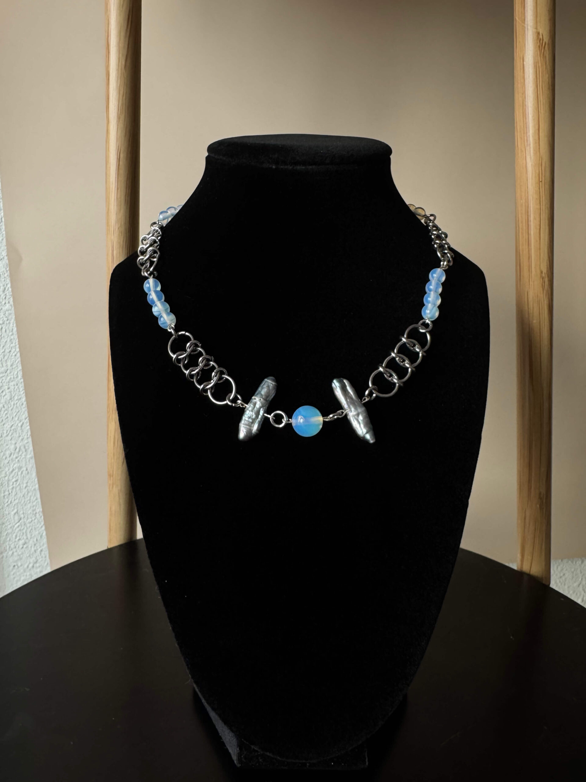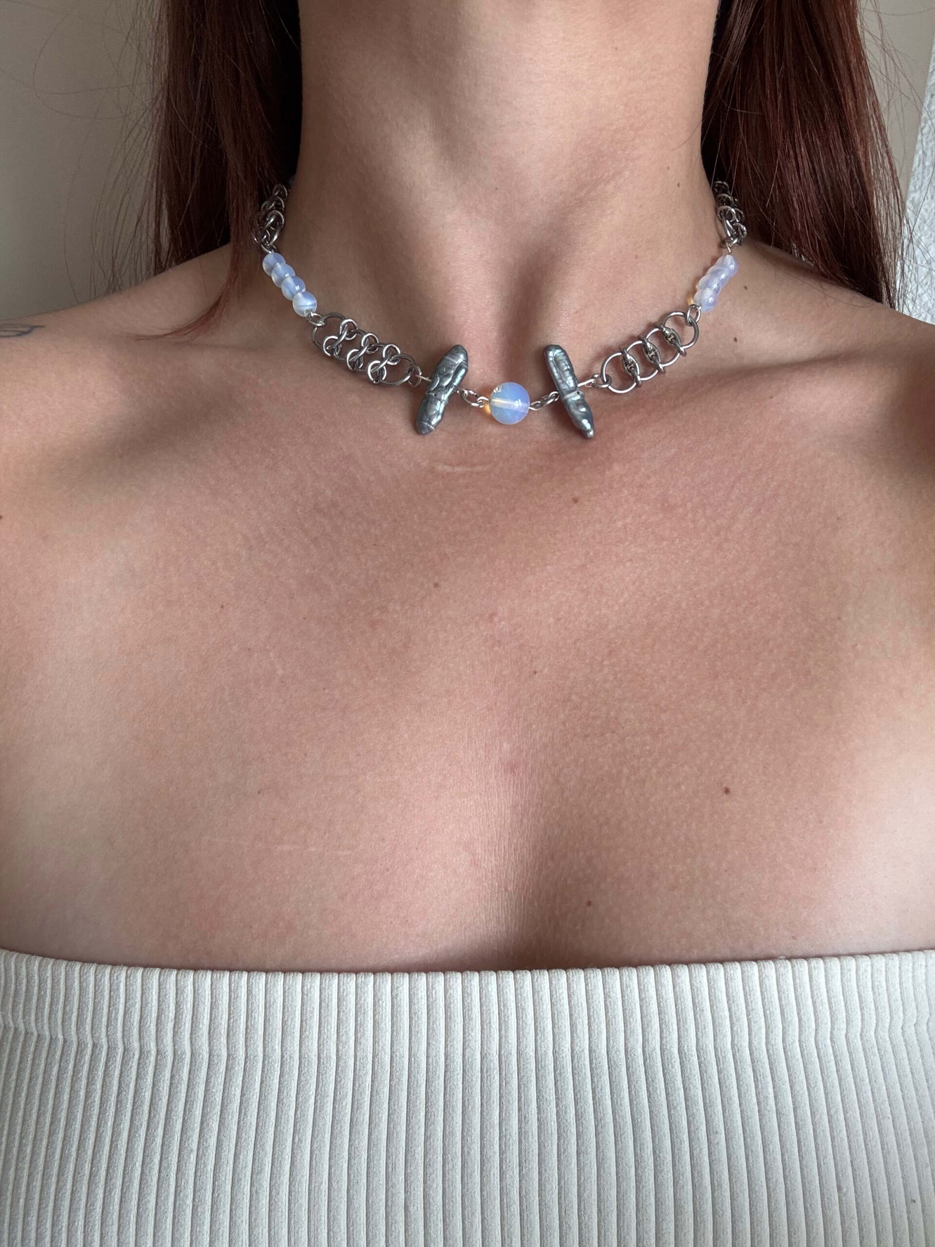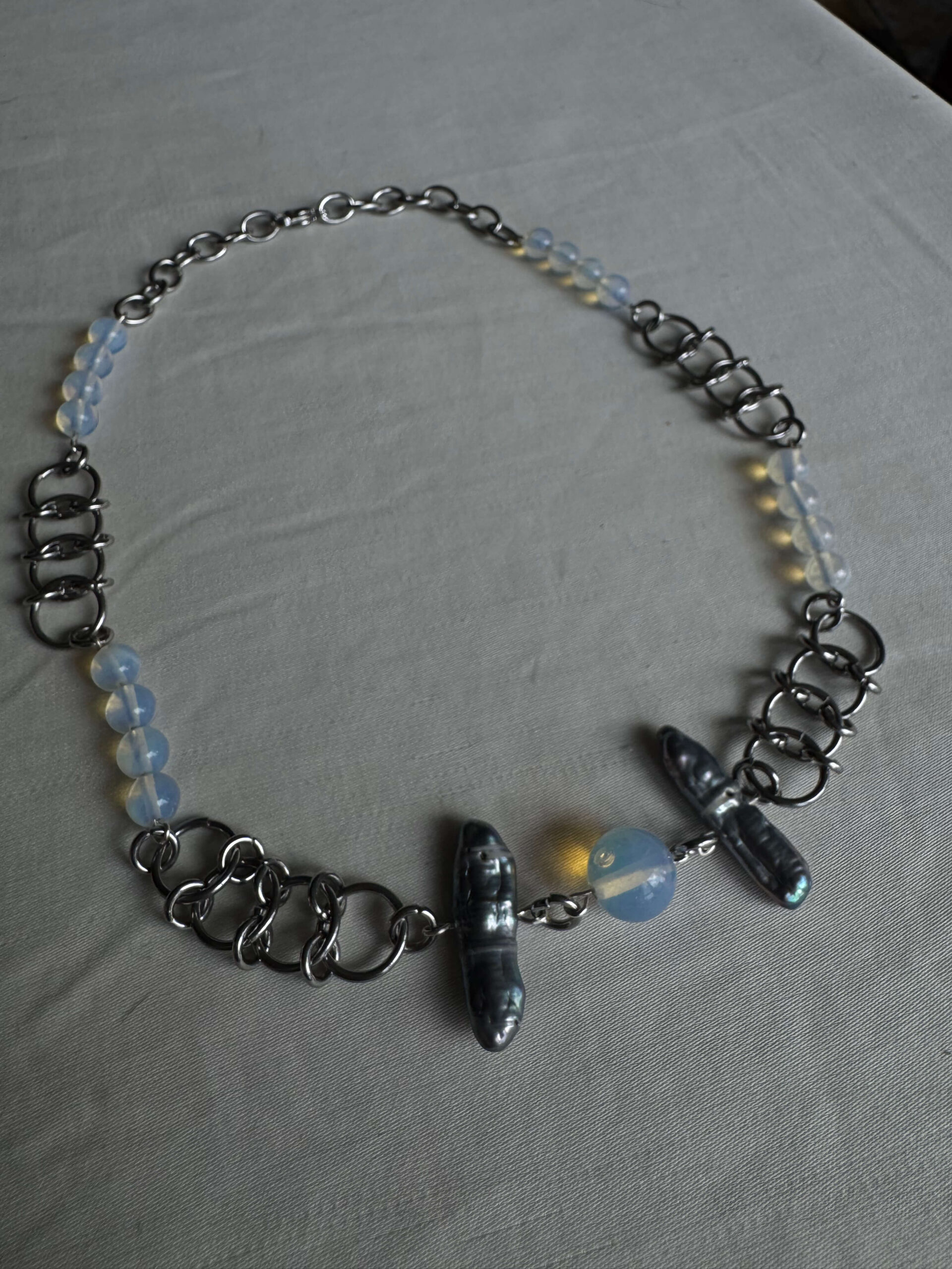 Each piece is crafted from stainless steel, opalite beads, and baroque freshwater pearls. Each pearl varies slightly in shape, tone, and surface — including subtle indentations or markings — making every piece unique.