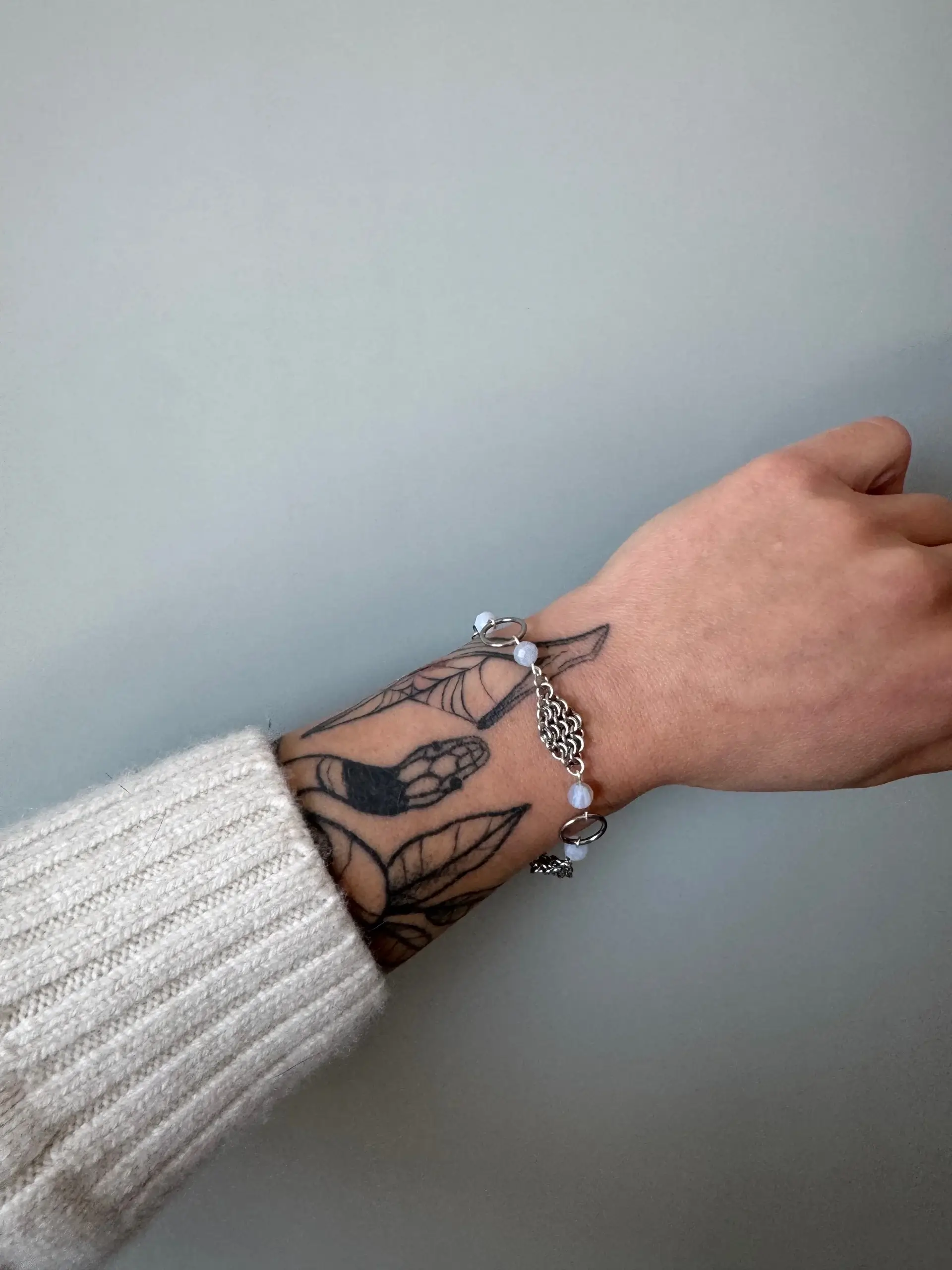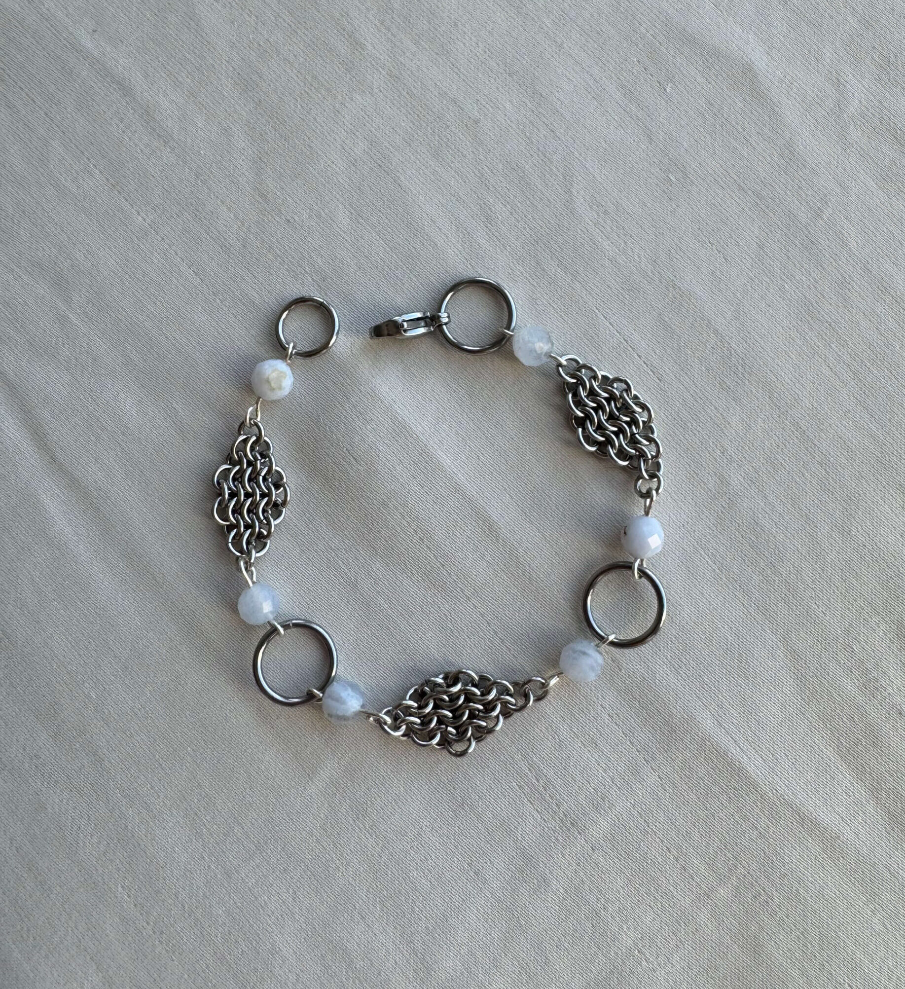 Fluid, balanced, and celestial. This chainmail gemstone bracelet is built from micromaille, circular forms, and blue lace agate details arranged in a continuous rhythm. Each element connects and repeats, creating a sense of motion that feels both grounded and in orbit. Lightweight yet present, this piece becomes part of your everyday movement.