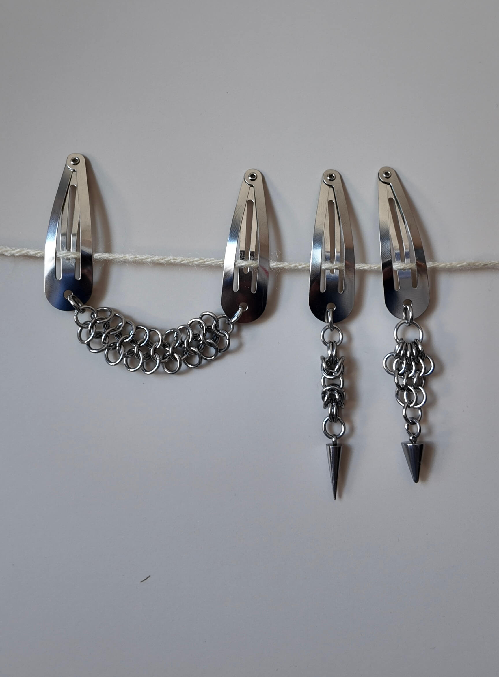 Each piece features an alloy metal barrette base for structure and hold. Adornments are crafted from stainless steel.