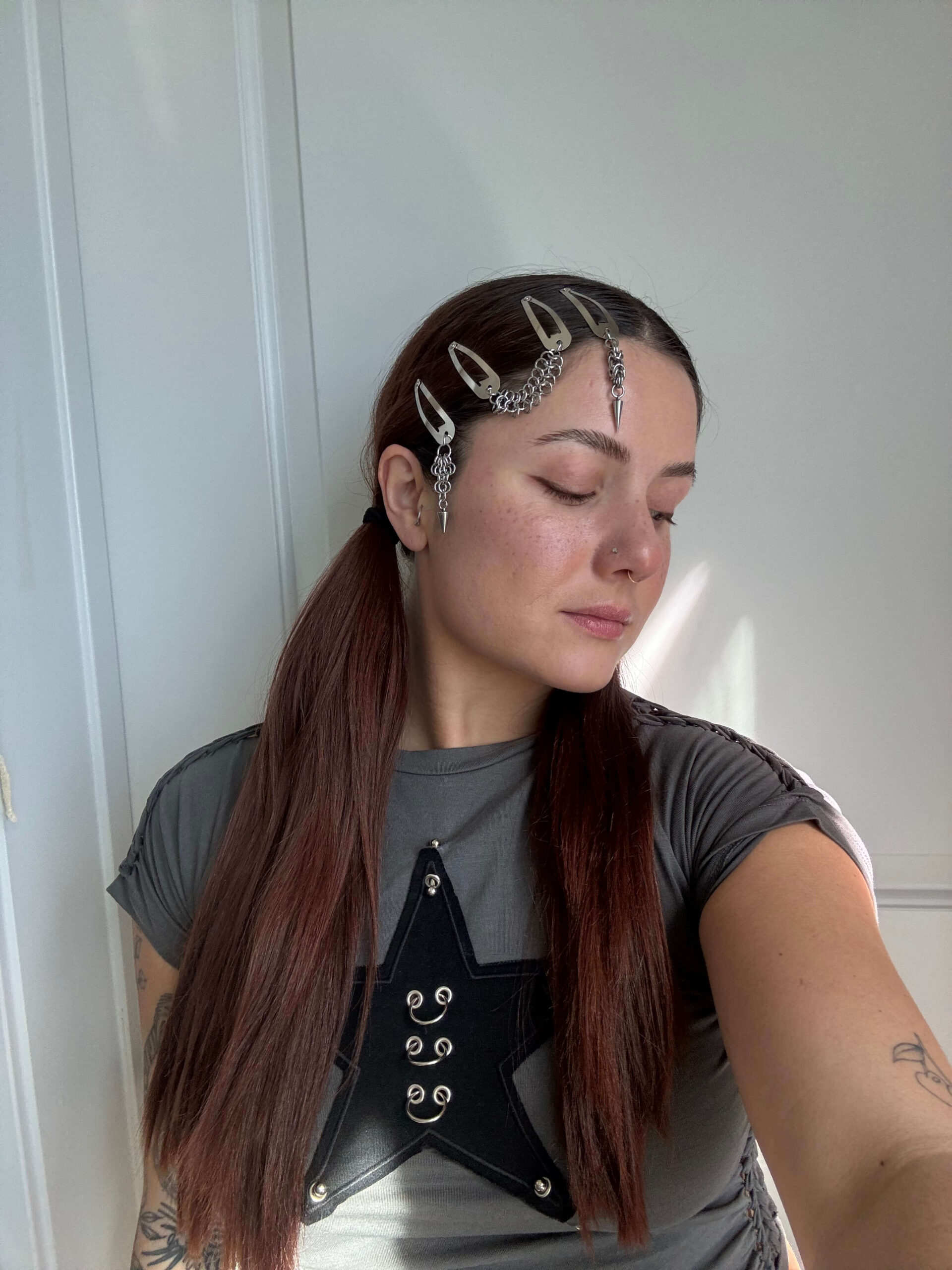 Sharp, modern, and effortless edge. A set of three chain hair clips designed to be worn together or individually. Clean lines and fluid metal create a look that feels both structured and undone – an easy edge that shifts the whole look.