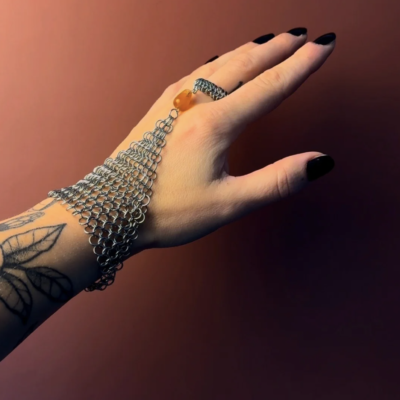 The votive hand chain –Â a handcrafted chainmail piece made from stainless steel and a single amber glass bead.
