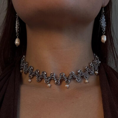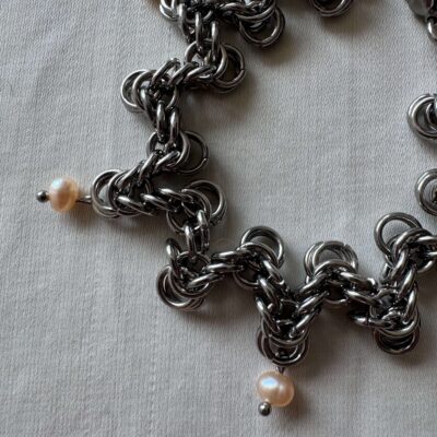 The Lana Choker – a handcrafted chainmail choker necklace made from stainless steel and freshwater pearls.