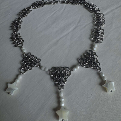 Celesse is a celestial chainmail necklace made from stainless steel, featuring white czech glass beads and finished with pearl star drop details.Â