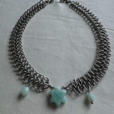 The Estelle Choker – a handcrafted gemstone choker necklace made from stainless steel, featuring a central amazonite star framed by amazonite stone details.
