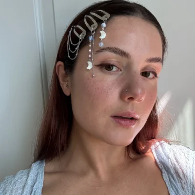 The Lunette Earrings — handcrafted chainmail earrings made from stainless steel, finished with pearl moon details. Designed as a part of the Winter Celestial Collection.