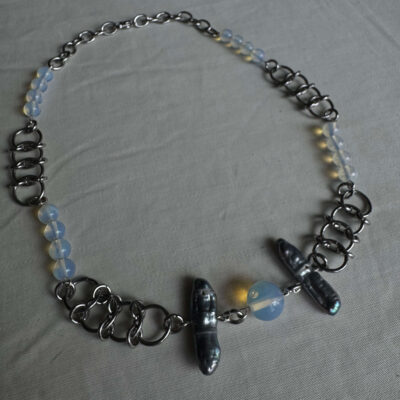Nixie is a handcrafted pearl and bead necklace made from stainless steel, baroque freshwater pearls, and opalite beads.Â