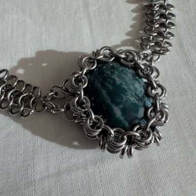 The Petra Collar – a handcrafted statement collar necklace made from stainless steel, centered with a chain-captured blue moss agate stone.